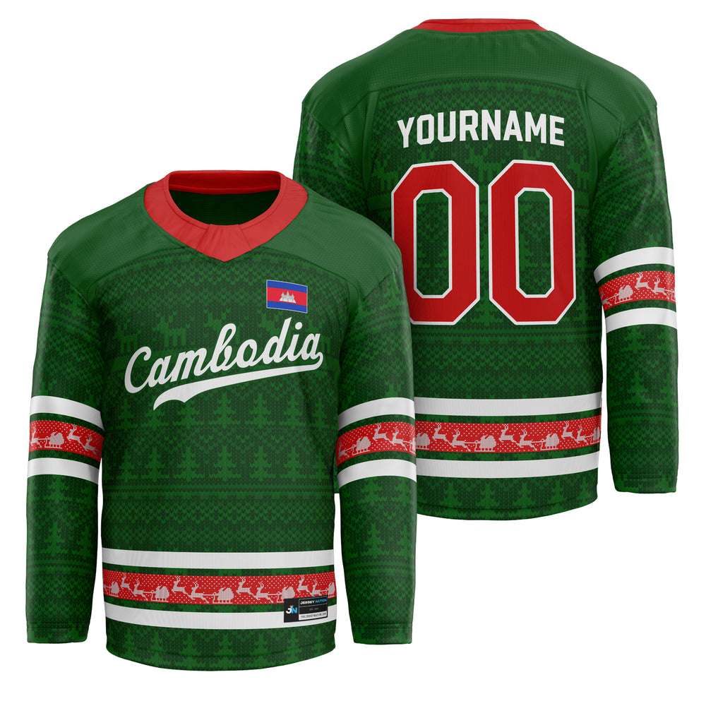 Show your Cambodian pride this holiday season with our fully sublimated Cambodia Christmas Custom Hockey Jersey. Designed with festive Christmas Holiday patterns and national colors, this jersey is perfect for Christmas parties, family gatherings, and holiday gifting.