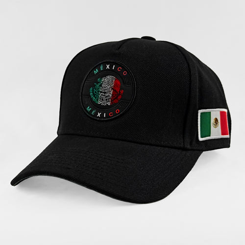 The front panel features a detailed embroidered México crest in red, white, and green, while the left side proudly displays the Mexican flag patch.